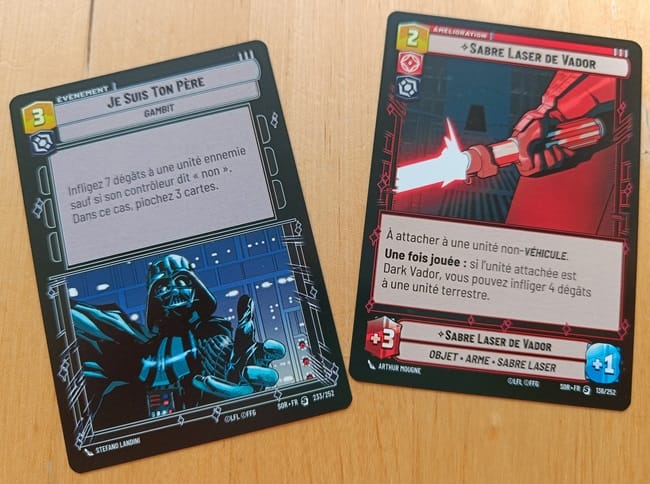 Est-ce que j’ai aimé ? Plutôt, oui. Je trouve les décisions du jeu plutôt intelligentes, voire très intelligentes. Il s’agit de gérer ses deux lignes de front, le spatial étant plus rare que le terrestre. Ces fronts sont autant de timers, d’outils de pression qu’on va mettre à notre adversaire. On aura toujours le choix d’attaquer l’adversaire ou sa base… mais c’est souvent au prix de sa propre capacité de réaction. L’aller-retour très intense entre les joueurs fonctionne à merveille mais l’ensemble manque pour moi de folie – après, c’est un premier set, ça sera vite étendu, et FFG aurait dit avoir deux ans et demi d’avance sur les produits –, mais peut-être que je ne considère pas ce genre de jeu avec un œil suffisamment neuf. En tout cas, j’ai préféré Altered pour ses innovations, et Lorcana me semble moins hostile et plus instinctif. Mais c’est sans doute un entre deux et un univers qui parleront à pas mal de gamers. (Star Wars tentant d’agiter chez moi une nostalgie inexistante ; de base les licences ne me parlent pas beaucoup mais alors celle-ci, elle ne me fait ni chaud ni froid.)