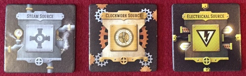 En premier lieu, il me faut vous expliquer ce qu’est une machine à Steam Works. Une machine est composée d’une source d’énergie (horlogerie, vapeur ou électricité) et de plusieurs tuiles autant de « composants » connectés à la source. Sachant que les composants acceptent une, deux ou les trois sources d’énergies, il va vous falloir être vigilant.