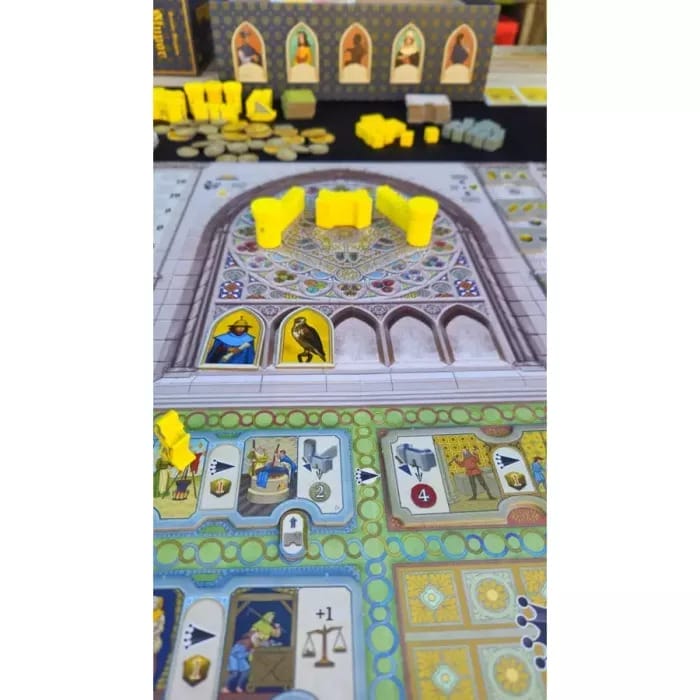Un certain nombre d’actions peuvent en effet permettre de déclencher des Décrets qui modifient l’équilibre du Palais impérial. Les Décrets incarnent les volontés mouvantes de Frédéric II. Qu’il s’agisse de décisions politiques, d’allocations de ressources ou de nominations, ils marquent des tournants importants, octroyant des récompenses décisives et faisant évoluer les enjeux en cours. Un Spécialiste atteint telle case de la piste Labeur ? Paf, un Décret. Vous avez bâti telle Muraille prestigieuse ? Pif, un Décret. Et qui dit Décret, dit récompense pour vous. Mais ce n’est pas tout : cela va aussi retirer ou ajouter des éléments du Palais de Frédo. Vous comprenez que tout est lié : convoquer certains Alliés vous pousse à changer la donne via les Décrets pour favoriser vos conditions de scoring et/ou mettre un adversaire dans la panade.