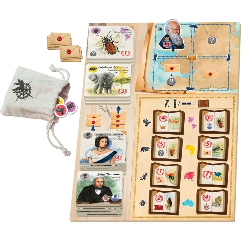 Dans le jeu de base, il existait une action qui nous permettait de gagner le jeton Darwin, ce qui avait pour effet de nous donner deux points de victoire en fin de partie. Ici, il est lié au plateau Angleterre qui est une grande nouveauté de cette extension. Avec une couronne, on déplace Darwin sur ce plateau et l’on récupère des jetons Enveloppe, des jetons Classification, etc.