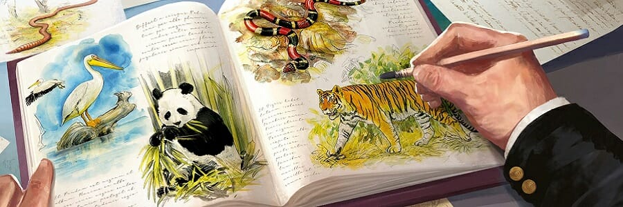 Avant de se lancer dans l’exploration ludique, il faut absolument s’arrêter sur la magnifique édition du jeu. Que ce soit les plateaux, et même l’intérieur de la boîte, on y retrouve des esquisses ou des illustrations soignées des différentes espèces animales. En introduction du livret de règles, donnant le ton et le sérieux avec lequel le sujet est traité, on peut lire un survol de la vie de Darwin. Pour boucler la boucle, un carnet de voyage reprenant à la fois les étapes du Beagle mais aussi les illustrations et spécificités de chaque animal rencontré dans le jeu accompagne les règles. Un carnet qui sert à renforcer le thème et nous en apprendre un peu plus sur l’environnement que nous allons croiser pendant la petite heure (ou moins) que dure la partie. Un bel ajout, à tout point de vue.