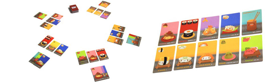 « Pendant que les cartes Sushi passent de mains en mains entre les joueurs, choisissez quelles cartes vous placez devant vous. » Collectionnerez-vous les raviolis ou tenterez-vous d’avoir le plus grand nombre de desserts qui ne compteront qu’en fin de partie ? À moins que vous ne préfériez viser les paires de tempuras ? À vous de choisir. Mais regardez bien quelles cartes prennent vos adversaires pour les contrer ! Mémorisez, anticipez et visez la meilleure combinaison de cartes.