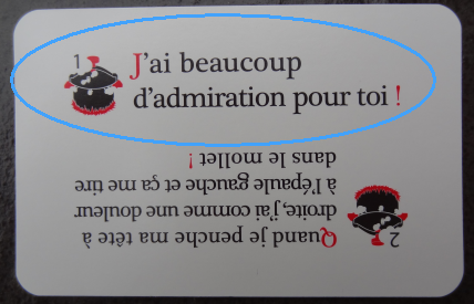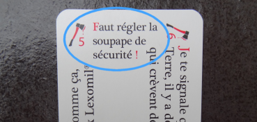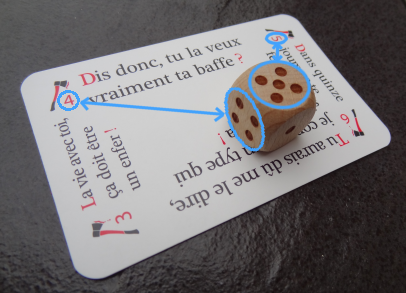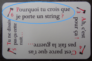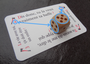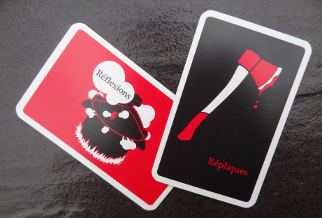 À noter qu’une carte « réflexions » comporte deux réflexions, l’une portant le numéro 1 et l’autre le numéro 2, et qu’une carte « répliques » comporte quatre répliques numérotées de 3 à 6. Même si le fascicule ne fait aucun commentaire à ce sujet, on est donc implicitement invité à inventer et expérimenter des règles encore plus chaotiques faisant intervenir un tirage aléatoire de réflexions et de répliques au moyen du dé. Cette flexibilité et l’aspect peu directif des règles écrites est indéniablement un plus, puisqu’il permet de s’approprier le jeu et de l’adapter ou de le réinventer à sa sauce. Ce qui compte, c’est les phrases, et elles sont drôles.