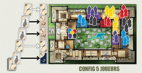 A votre tour, vous choisissez au moins 1 de vos samuraï et vous le faites changer de pièce (il y a des flèches qui vous montrent le bon chemin, c’est toujours dans le sens horaire, c’est bien connu) sachant que s’il n’y a des samuraïs d’autres joueurs, vous devez en trimballer au moins un d’entre eux. Sachant aussi qu’une pièce peut être vidée s’il y a plus qu’un 1 ou 2 gus sur place. Au-dessus, on est obligé d’y laisser au moins 1 samuraï. Le choix de quels samouraïs partent et lesquels restent – ceux des autres et/ou les vôtres – appartient au joueur.