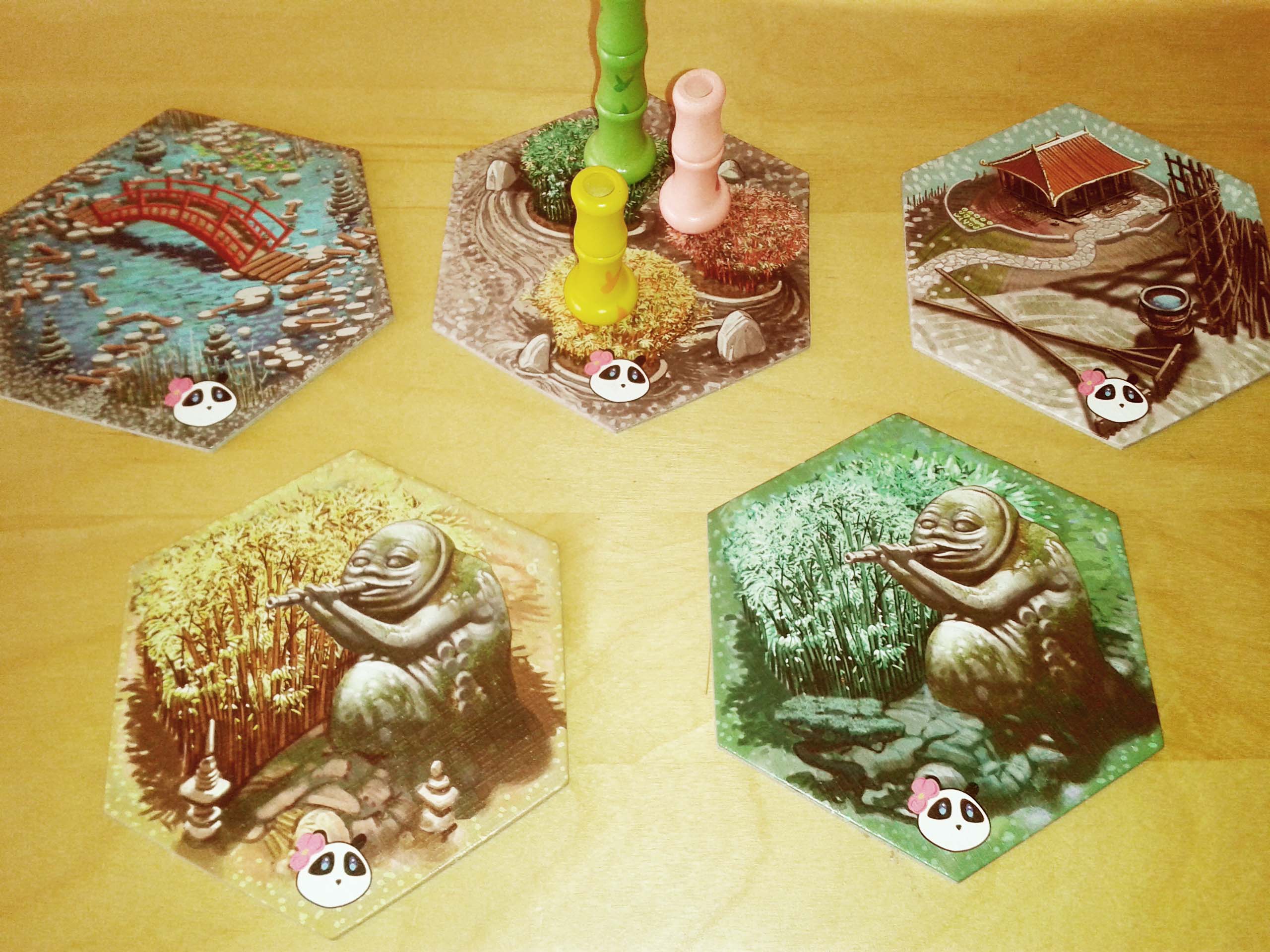 - Le jardin des kamis : cette tuile est là pour rendre tout le monde content. Elle porte les trois couleurs simultanément, et du coup trois bambous poussent dessus en même temps. Ca rend la vie plus facile aux joueurs parcelles (ouah ! une tuile joker qui rentre dans tous mes objectifs !), aux joueurs bambous (ouah ! trois bambous d’un coup), et aux joueurs pandas (ouah ! Quand je bouffe ici, j’ai le choix des plats !) Fort sollicitée, cette tuile devient l’un des principaux points chauds du plateau où jardinier et pandas se succèdent allégrement.