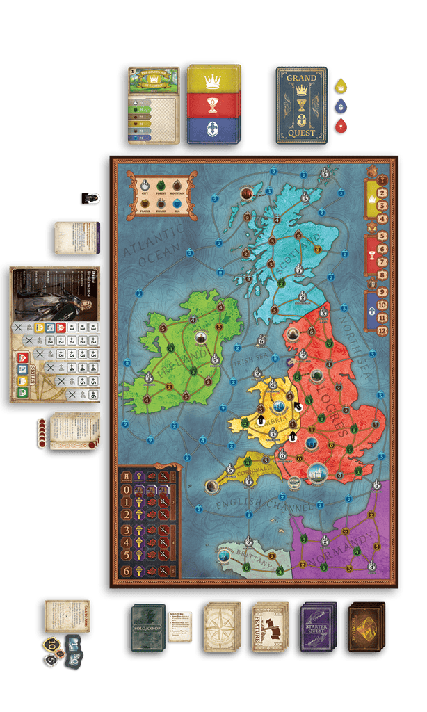 La boîte de base contient également des chevaliers en standees, un livret de règles complet et plus de 350 jetons qui serviront à suivre toutes sortes d’afflictions et autres ressources. Le plateau de jeu couvre une zone allant du Royaume-Uni, à l’Irlande, le nord de la France et la Bretagne.