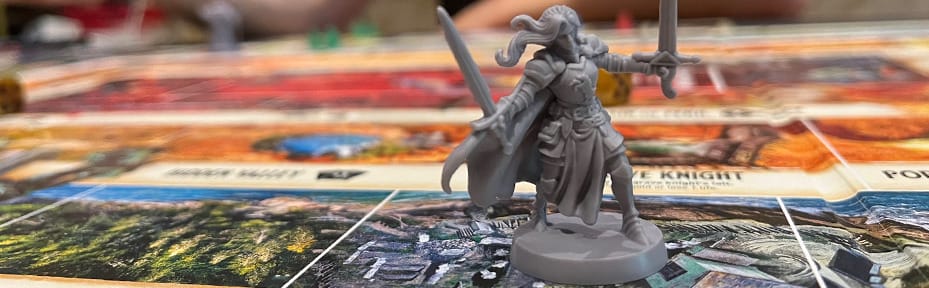 L’édition est globalement propre, reflétant plus ou moins cette époque des 80’s, quand la high fantasy n’était pas à la mode, en s’inscrivant dans une relecture moderne, un peu léchée (on se retrouve assez loin du style de Garry Chalk, l’illustrateur des premières éditions, connu aussi pour ses contributions à la série Lone Wolf). Quant à la lisibilité du plateau, ouch. On aurait limite aimé avoir une aide de jeu qui nous récapitule les effets des lieux plutôt que d’avoir à se lever pour aller lire du texte écrit à l’envers en tout petit de l’autre côté de la table. Et une fois qu’on laisse des cartes sur les cases, c’est le chaos ! Côté illustrations, certains n’ont pas goûté le fait que les terrains étaient tous tournés vers l’intérieur mais cela ne nous a pas particulièrement choqué. Les cartes sont pour leur part belles et lisibles, les figurines seront agréables à peindre.