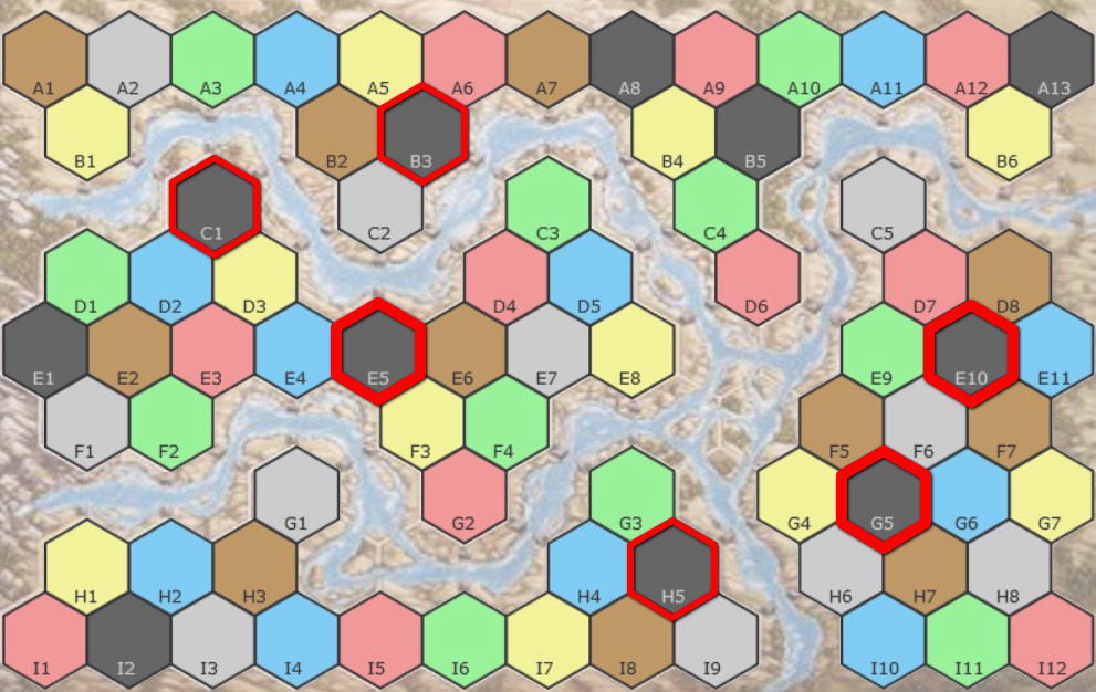 Les hexagones les plus favorables sont théoriquement les mêmes que pour les Alchimistes (voir ci-dessus). La différence d’appétence pour la navigation a cependant un impact notable sur le choix positionnement. Ils préfèrent en général éviter de choisir deux hexagones trop éloignés. Ils sont donc encore plus friands du continent Est, et il n’est pas si rare de terminer la partie sans navigation et un réseau de 11-12 hexagones (qui peut parfois valoir une place sur le podium) uniquement sur ce continent. Pour peu qu’un adversaire gris soit en jeu, qu’un vert s’installe en E9 ou un marron en F5, un rouge en D7… la combinaison la plus classique fonctionne : G5-E10 Dans le cas contraire, il vous faudra vous exporter hors de vos bases favorites pour aller chercher des voisins, que cela soit en H5, ou à l’ouest en C1-E5. Il est à noter que B3 prend un autre visage, puisqu’un face à face avec des Nomades en A5 ne vous effraie pas : si vous jouez avant eux, vous avez le prêtre pour leur ravir B2, et accéder ainsi à A4. |