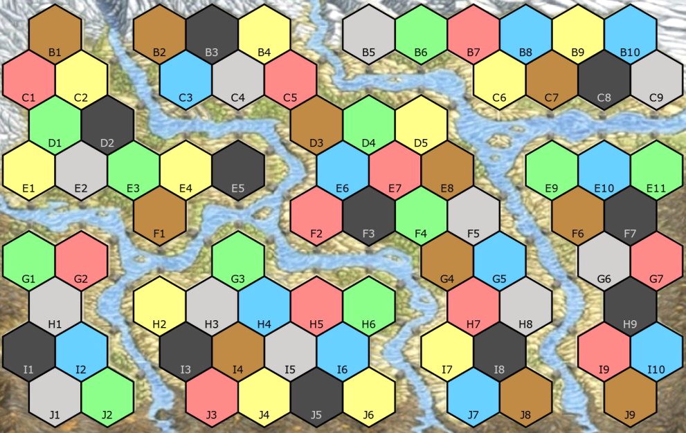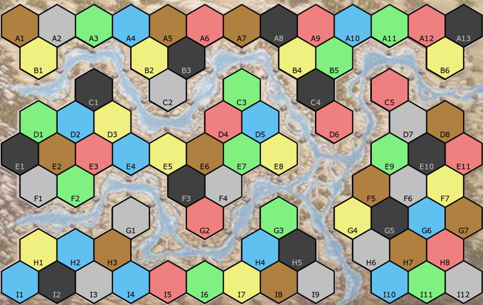 Pour plus de facilité, chaque hexagone est désigné par une lettre (de A à I) correspondant à la ligne horizontale auquel il appartient, et un chiffre (de 1 à 13) correspondant à sa place dans le sens de lecture sur cette ligne. Ce n’est pas un numéro de colonne, puisque chaque ligne n’a pas le même nombre d’hexagones : D5 est ainsi adjacent à E7 et E8 par exemple.