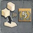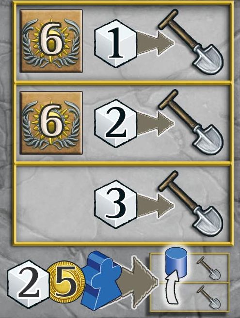 ![]() ![]() ![]() | C’est le bonus le plus fréquent puisqu’il figure sur 3 des 8 tuiles : il est souvent présent deux fois. Son effet de seuil fait toujours un peu peur, et il vaut mieux bien calculer son coup pour viser la case 8. Il fournit une ou deux pelles à bon prix : en bénéficier dès la fin de manche 1 ou 2 est un atout conséquent. Attention à l’ordre du tour au moment d’utiliser ces pelles : visualisez bien les possibilités de ceux qui joueront avant vous lors de la manche à venir. | |