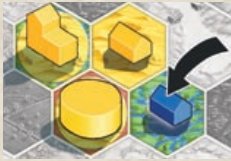 ![]() D Dwelling | Voir 2.3 pour les Dwellings de départ. Si vous visez 3 villes, vous aurez besoin de 11 ou 12 structures dans vos villes, donc évitez d’essaimer des Dwellings ailleurs sous peine de tomber à court. Avec deux villes uniquement en ligne de mire, vous pouvez vous permettre d’en détacher quelques-uns prématurément via la navigation, d’autant plus si cela vous permet de réserver des hexagones nécessaires à la connexion de votre futur réseau avant qu’ils ne soient pris par un adversaire. | |