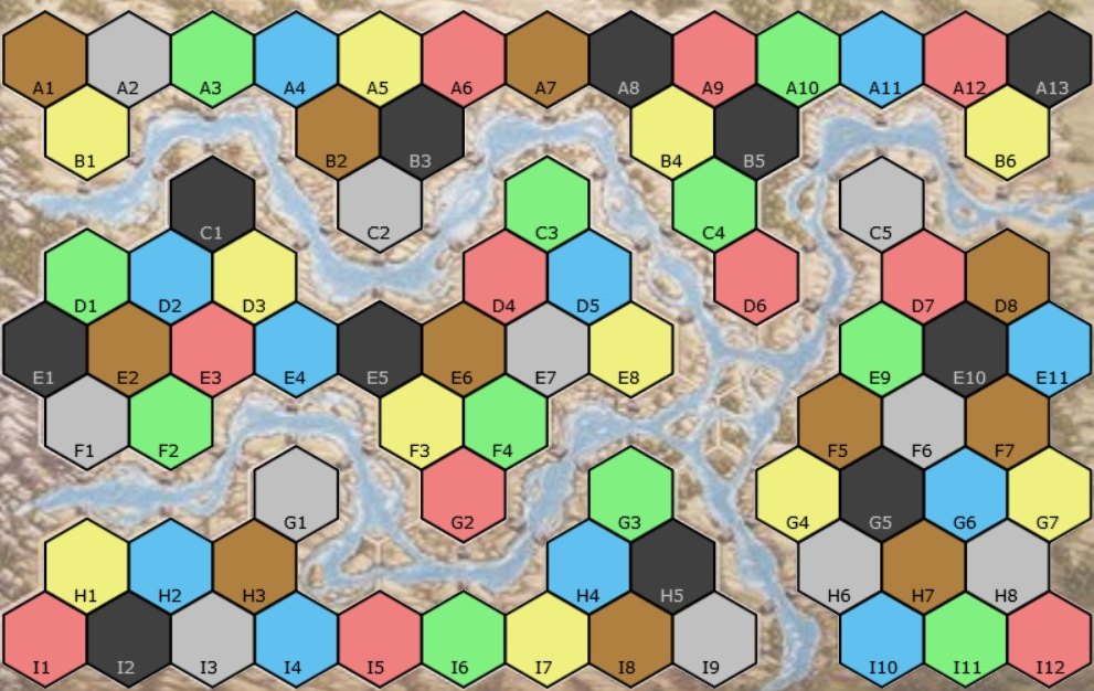 Pour plus de facilité, chaque hexagone est désigné par une lettre (de A à I) correspondant à la ligne horizontale auquel il appartient, et un chiffre (de 1 à 13) correspondant à sa place dans le sens de lecture sur cette ligne. Ce n’est pas un numéro de colonne, puisque chaque ligne n’a pas le même nombre d’hexagones : D5 est ainsi adjacent à E7 et E8 par exemple.