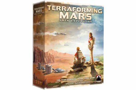 Expédition Arès est la version cartes de ce vénérable… qui était pourtant déjà card-driven. Passé le haussement de sourcil, on se penche sur la question. Expédition Arès retire le principe de générations qui donnait un aspect cyclique à TM : ici, on se choisit une phase parmi cinq, déclenchée pour tous les joueurs, avec un bonus pour nous. Cela ferait-il penser à Race for the Galaxy ? Un peu, mon neveu !