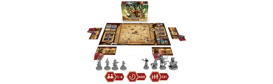 Question direction artistique, la question est vite réglée. Soit vous aimez les illustrations de la BD, et là c’est du tout bon, soit ce n’est pas le cas et il y a peu de chance que le jeu vous parle visuellement. Car il est bien entendu parfaitement fidèle à la dite BD ce qui d’ailleurs, outre son thème, lui confère une certaine originalité. Les quelques figurines présentées (4 héros et 4 monstres) semblent être de bon aloi et l’ensemble du matériel est au final assez joli. Les plateaux joueurs sont double couche, et ça c’est très bien. »
