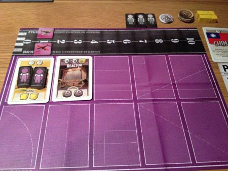 - et son propre plateau qui va contenir tous les bâtiments achetés par le joueur, ainsi que sa piste de chasseurs et de bombardiers, car oui, dans TMP, on peut se mettre joyeusement sur la figure, et le fait d’agresser un joueur adverse est aussi jouissif que dévastateur, mais la tactique offensive est à manier avec précaution car elle peut conduire très rapidement à une annihilation mutuelle…