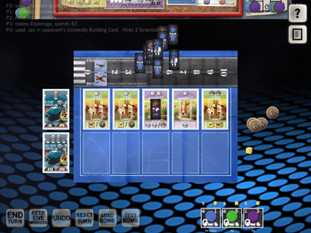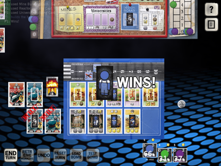 - Tout le jeu tient sur une table virtuelle. Passer d’un plateau à l’autre, n’est que zoomer sur une partie de cette table virtuelle. Ca pourrait être une bonne idée. Ca pourrait. Sauf que c’est mal exécuté, globalement. D’abord parce que ça vous oblige à vous balader en permanence pour voir ce qui se passe sur les plateaux des autres, et ensuite parce que lorsqu’on dézoome, on ne peut plus rien lire, même sur un iPad Air Retina machin à dégivrage convexe. Ensuite, parce que le concepteur a eu la meilleure fausse bonne idée du monde : certains composants de jeu (typiquement, les ouvriers, les cartes, les bâtiments…) sont déplaçables par le joueur. Ca permet notamment de déplacer les jetons d’agents pour les compter. Vous savez déjà ce que je pense de cette brillante idée. Par contre, ce que ça fait très bien, c’est que lorsqu’on se ballade à grands coups de « pinch » et « swipe » pour passer d’un plateau à l’autre, et bien on déplace des trucs sans s’en rendre compte. Vous lisez bien ! Vous savez, le joueur que tout le monde hait l’espace d’un moment, après qu’il ait d’un revers de coude déplacé tous les composants sur le plateau, ce qui fait qu’on doit tout remettre de mémoire, et il vous reste toujours au font de votre esprit une petite voix fourchue qui vous dit : « je pense que t’avais au moins un bombardier de plus », et bien on peut ENFIN le faire de manière électronique. Alors, heureux ?