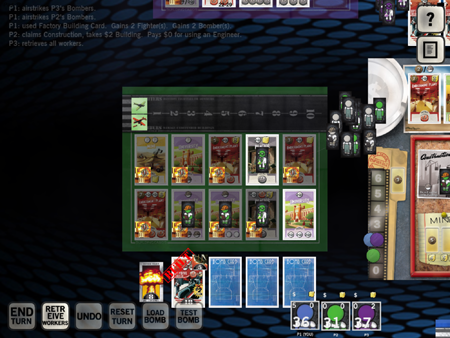 Il n’y a absolument aucune surprise à ce niveau. On a affaire à un scan pur et simple des éléments du jeu de plateau. L’avantage, c’est que si on a joué au jeu de plateau, on n’est pas dépaysé. Le souci, c’est que le jeu de plateau lui même n’était déjà pas parfait à ce niveau là. Le matériel de jeu est un peu cheap, et même si c’est tout à fait compensé par des illustrations magnifiques et qui collent superbement au thème, ça reste que du carton, pas le moindre morceau de plastique dans la boite. Et du coup, on se retrouve dubitatif face aux marqueurs carrés qu’on voit se déplacer sur le plateau. Pourquoi ne pas faire des compteurs pour remplacer les marqueurs chasseurs / Bombardiers ? On a droit à des compteurs pour l’argent et le yellowcake (avec des chiffres, qui prennent peu de place et sont lisibles, sont mis à jours rapidement, bref, c’est pratique les compteurs), mais pour les bombardiers et les chasseurs, on se retrouve avec un marqueur qui se déplace sur une piste de 0 à 10.