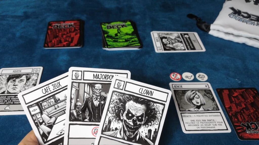 Une fois que cette phase est terminée (la pioche finie), vous passez à la phase interrogatoire où la pile de cartes mémorisées va être dépilée (en sens inverse donc de ce que vous avez vécu). Vous dépilez donc les péripéties une à une en appliquant cette fois l’effet particulier de la phase interrogatoire indiqué sur les cartes.
