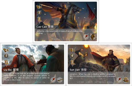 Les joueurs commencent le jeu dans différentes positions : l’un fait le poirier, l’autre se tient sur une jambe et le dernier est assis normalement, ce qui reflète les avantages de la main-d’oeuvre du royaume de Wei dont jouissait Cao Cao au début de la période. Les États les plus faibles de Wu et Shu se protègent en formant une alliance. Petits peut-être, mais malins !