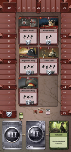 Et vous pouvez bien imaginer que toutes ces situations de grandes guerres où vous sacrifiez toutes vos forces militaires pour obtenir plus étaient non-thématiques (non, les gagnants ne détruisent pas la totalité de leur armée afin d’obtenir plus de butin) et conduisaient a beaucoup de problèmes de kingmaking. Nous avons augmenté la force des guerres de l’âge III légèrement, de sorte qu’elles valent encore le coup. Cela signifie également que la règle pas très élégante à propos du refus du sacrifice dans le dernier tour a maintenant disparu. » Dont acte.