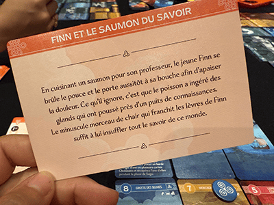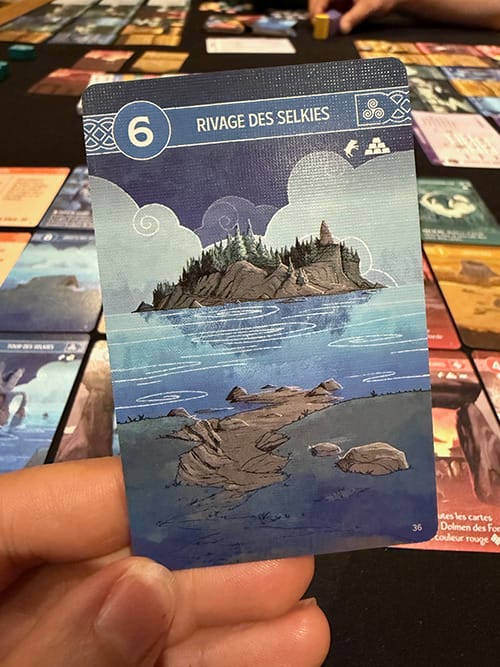 Côté thème et réalisation, la direction artistique attire l’œil. On part sur un thème qui certes n’est qu’habillage, mais la carte du vieux celte est jouée à fond, jusqu’à mettre un guide de prononciation en dos de page des règles, ou des résumés de légende au dos des cartes Geis comme on l’a vu. Des petites attentions qui font mouche, témoignant d’une véritable recherche, même si on reste sur un jeu assez abstrait dans son ADN et que tout cela n’est pas plus intégré que ça dans le jeu, in fine. Le reste de la production est à l’avenant et les composants sont de belle qualité. Bon, la boîte est un peu trop grande, c’est dommage, elle aurait pu être deux fois plus petite. Les textes (rares) sur les cartes, un peu trop petits. Mais des regrets assez mineurs au final de ce côté-là.