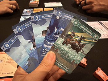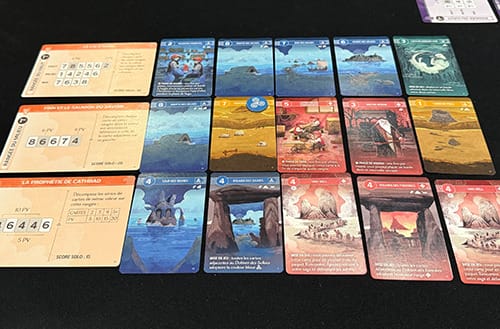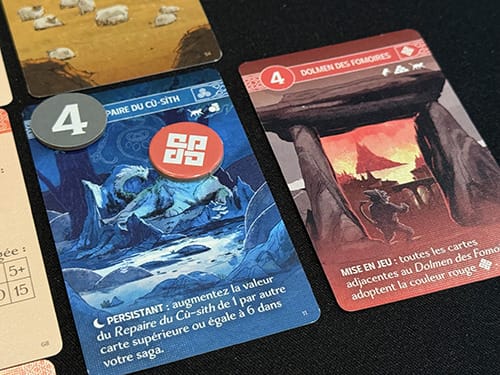 Chaque carte posée entre dans notre tableau (notre “saga”) dans le but de satisfaire aux objectifs de la partie, appelés ici des “Geis”. Là est le cœur du jeu, l’horizon de votre attention. Trois lignes, trois Geis, autant de contraintes fortes pour marquer un max de points (et des résumés de légendes celtiques au dos pour ceux qui s’ennuient).