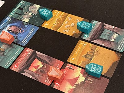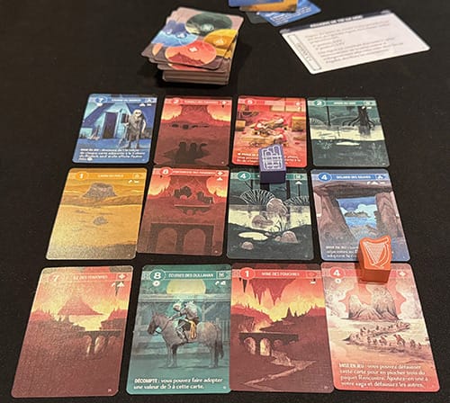 Un tableau de cartes commun, affichant couleurs et valeurs, sert de marché. Chacun son tour, on place un de nos trois meeples bardes à l’intersection de deux cartes (parfois plus si l’on jouit d’un pouvoir). Se placer est doublement stratégique puisque cela nous permet de récupérer des cartes (on choisit entre celles reliées par notre barde) mais aussi donner des coups de pression aux adversaires. Le jeu repose sur un placement bloquant – sauf si un pouvoir vient l’assouplir.
