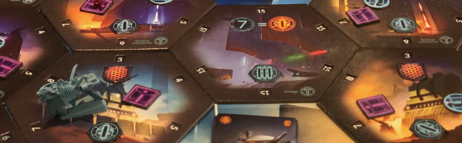 On va donc parler aujourd’hui de Tortuga 2199 (de Michael Loyko et Denis Plastinin, illustré par Andrew Mironov). Il s’agit d’un jeu dans lequel vous incarnez des pirates, mais de l’espace, où il faudra devenir le roi des pirates. Bon, en termes de thème, on a peut-être vu plus original, mais si celui-ci est bien exploité, pourquoi pas. Je vous avais fait un retour à chaud sur ce jeu lors du Cannes Canapé, et j’ai depuis fait une partie de plus. Développons un peu tout ça.
