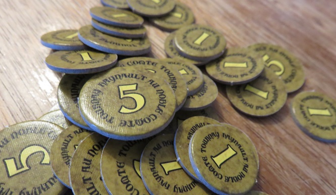 On a perdu des deniers à cause des évènements, en payant le coût de pose des cartes ou en engageant des meeples adverses. Pour une action on peut gagner des deniers en engageant nos meeples. Toujours au taux de 2 deniers pour un meeple. On ne peut utiliser que des meeples de la même couleur pendant notre tour. Donc trois meeples blancs par exemple pour 6 deniers. Quand on en arrive là trop souvent ça ne sent pas bon.