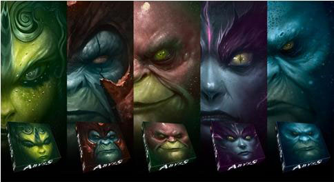 Parallèlement à cette lutte de pouvoir pour les trônes d’Abyss, ces 5 familles principales (Cultivateurs, Militaires, Politiciens, Marchands et Mages) ont tenté d’élire le digne représentant de leur civilisation afin qu’ils soient sur la couverture du jeu… Hélas, ne se mettant pas d’accord, c’est à l’éditeur qu’est revenu la lourde tache de choisir quelle égérie serait en première page… Par peur de représailles des peuples sous marins ou pour offrir aux joueurs un choix crucial dès la sélection de la boite, Bombyx nous propose 5 couvertures différentes !