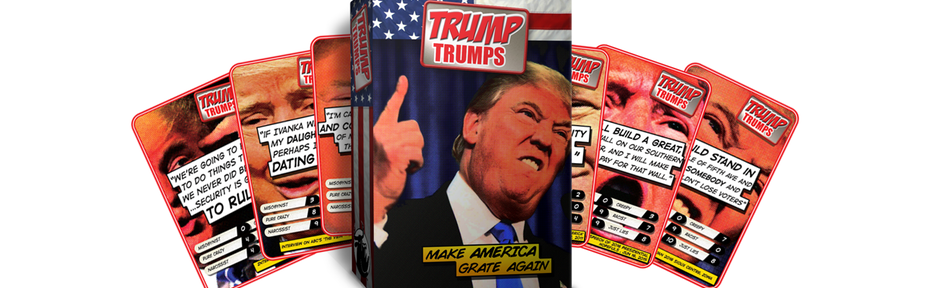 Bon aujourd’hui, on vous gâte ! Parce qu’on aime bien les jeux qui sortent des rangs, voici l’incroyable Trump Trumps, un jeu opposant « les pires côtés de Donald Trump contre lui-même, livré avec des masques Trump ! ». Attendez… avec des quoi ?