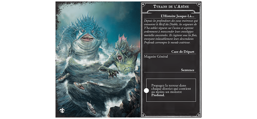 « La terreur représente l’invasion d’un district par la folie et la crainte ; certains scénarios sont ainsi associés à un paquet Terreur unique. Elle peut être déclenchée par l’augmentation du nombre de fléaux dans un district ou la pioche d’un pion Mythe Terreur et, quand cela se produit, vous devez piocher une carte Terreur pour la placer au sommet du paquet Rencontre de votre district. Vous aurez donc à affronter vos peurs en retournant la carte pour poursuivre votre exploration de ce paquet. » développe FFG sur son site.