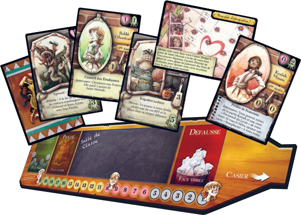 Et là, bim, on paie les frais de scolarité. Oh ils ont travaillé leur thème hein ? Oui on paie les frais c'est-à-dire qu'on regarde combien on a en main pour faire nos petits achats. Si vous achetez une carte Etudiante, vous augmentez vos possibilités de Défense. Elles ont chacune leurs petites caractéristiques. Si vous vous payez les services de profs cultistes, c'est pour faisander les decks adverses avec des effets qui vont les embêter. Il existe également des cartes Evénements (positifs et négatifs), dés qu'elles sont révélées, on applique leurs effets (ça peut être "défaussez vos étudiantes" par exemple) d'autres cartes sont persistantes, il faudra les ranger au "casier" pour qu'on les voit tout le temps. Elles produisent des points d'Amitié et de Cauchemar, du Girl Power et de la Détermination.