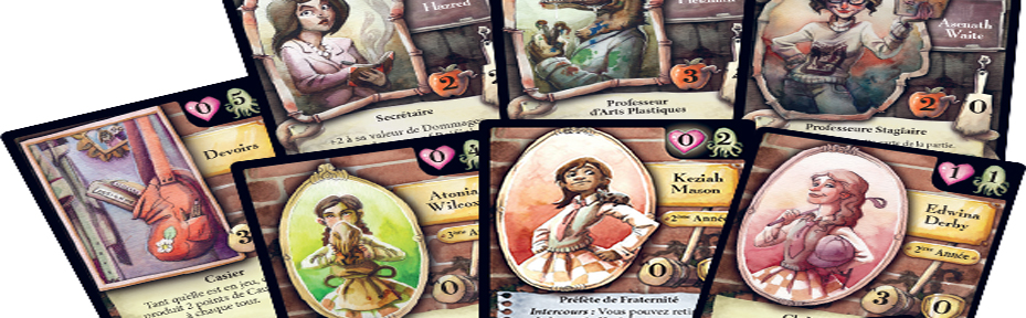 Parce que c'est du deckbuilding pas tout à fait ordinaire que nous avons là. Et parce que j'aime bien inventer des mots débiles. En l'occurrence, je le trouve pas si mal celui-ci. En effet, dans Miskatonic, on va non seulement faire du deckbuilding en essayant de construire son set proprement avec de jolies étudiantes, mais on va aussi et surtout pourrir le deck du voisin en lui intégrant des profs corrompus qui sont en fait des monstres poulpiques. Oui, le tout se cuisine à la sauce Cthulhu. Glurpps.