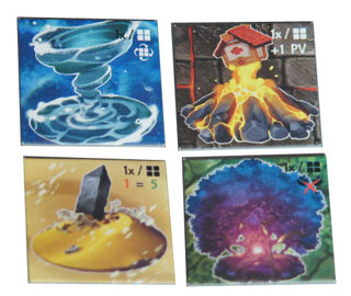 Les tuiles spéciales représentent la Forêt magique de Primitiva, la Croix rouge de Friburga, le Mirage de German Land et le Tourbillon d’Hexagon.