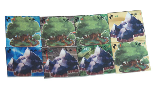 Les tuiles désignent des terrains spéciaux qui seront placés sur le plateau au début du jeu. Chaque peuple en possède 3, deux standards (une montage et une forêt) et une tuile spécifique à son sentier de la guerre.