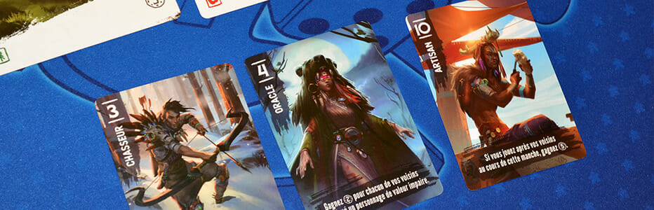 Autre point très agréable, l’interaction. On a très (trop) souvent l’habitude d’associer jeux de collection à « je joue dans mon coin ». Ici, on passe l’intégralité de la partie à surveiller nos voisins. Il faut d’une part surveiller les terrains qu’ils possèdent pour ne pas leur laisser des cartes trop avantageuses, selon ce que propose la rivière. Mais d’autre part, vous allez également devoir bien surveiller les cartes personnages déjà jouées, pour savoir si vous avez des chances de jouer avant vos adversaires grâce à l’initiative de la carte personnage, ou bien si ce que vous prévoyez de prendre pourra disparaître dans la main d’un adversaire qui influera sur la rivière avant vous.