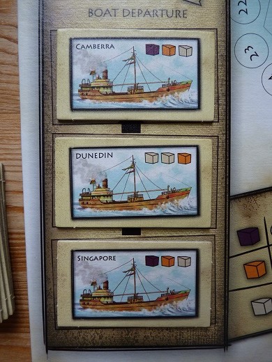 Il est possible d’acheter une denrée présente sur une case d’île adjacente au positionnement de son bateau, afin d’alimenter le marché extérieur et de gagner des points de prospérité.