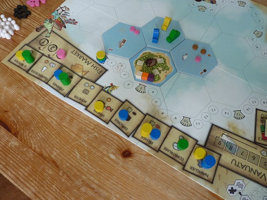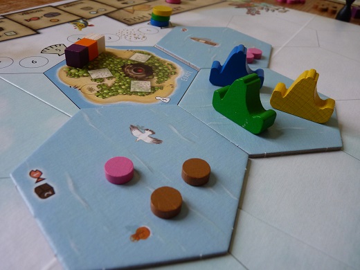 Du coup, devenir premier joueur est véritablement une action convoitée, d’autant plus qu’à chaque début de tour, c’est le premier joueur qui agrandit le paysage en plaçant, à sa convenance, deux tuiles supplémentaires. Cependant, il lui sera interdit de poser deux îles de manière adjacente (oui, j’ai bien vu que vous aviez pensé à enfermer vos amis dans des mers intérieures dépourvues de ressources!), ce qui limite tout de même la puissance de ce bonus. Il est toutefois souhaitable de tout faire pour éviter d’être trop éloigné dans l’ordre du tour sous peine de rapidement prendre du retard sur ses camarades, faute de pouvoir réaliser les actions souhaitées.