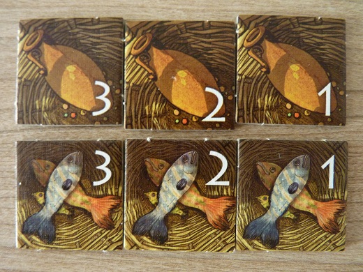 Un autre point important dans le jeu, c’est la notion de ressources épuisables. En effet, lorsqu’on place une nouvelle tuile en début de tour, il est indiqué le nombre de trésors ou de poissons disponibles à cet endroit. Ainsi, si un joueur entreprend une fouille (exploration ou pêche), il récupère un jeton du même nombre que le total de marqueurs de la tuile. Par contre, on retire ensuite un marqueur correspondant, ce qui affaiblit la quantité disponible pour les joueurs suivants. Ceci donne lieu à une lutte sur le terrain pour s’approprier les meilleurs emplacements, d’autant plus que les lieux pouvant accueillir des cabanes, des dessins ou des touristes sont également limités.