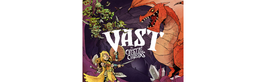 Vast: The Crystal Caverns fait partie des jeux qui seront visibles à la Gen Con après un passage réussi sur KS (vous le connaissiez peut-être sous le nom de Trove, alors apprenez qu’il a été rebaptisé en avril dernier), et il sort du lot car le héros est une héroïne. Oui madame. Une femme-chevalier, avec main gantée au fer et armure lourde sur les épaules. Elle a point peur de s’égratigner le nez en pénétrant dans la grotte où le dragon dort depuis de longue années. De très longues années. Si longues, que la grotte sous laquelle il est assoupi aurait profondément muté… Les gobs et d’autres monstres étranges se seraient appropriés les profondeurs obscures, et on dit que la grotte elle-même aurait acquis une conscience, qu’elle changerait, et qu’elle deviendrait de plus en plus dangereuse… Ceci étant dit, les rumeurs quant à ses dangers surpassent rarement celles qui courent sur ses trésors… Et des trésors, oui, il y en a…!