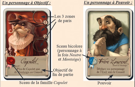 Les Capulet et les Montaigu vont chacun chercher à réunir le plus de membres de leur propre famille au Conseil. Les Lady des deux familles peuvent échanger de place des jetons d’influence déjà posés, tandis que Roméo et Juliette veulent être réunis (mais pas dans la mort si possible), et n’oublions pas leurs proches, Tybalt & Benvolio, qui peuvent déplacer des persos du Conseil vers L’Exil. On sent bien que ça va tirer dans les pattes et que l’interation sera au rendez-vous ! Heureusement, au milieu de tout ça, il y a quelques personnages pacifiques (la Nourrice de Juliette, Frère Laurent…) qui souhaitent la paix des familles et peuvent ramener des cartes de l’Exil vers le Conseil. Et puis, il y a les personnages totalement égocentriques comme Rosaline qui va chercher à séparer Roméo et Juliette, ou l’apothicaire, qui est l’ami de tout le monde et ne rapportera de points que s’il fait partie du plus grand groupe de personnages. Ha bravo !