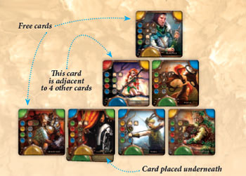 On ne placera pas sa carte n’importe où n’importe comment. Par exemple, une carte jouée au deuxième rang (ou plus haut) doit reposer sur deux cartes afin que les trois sections de ces cartes forment un cercle.