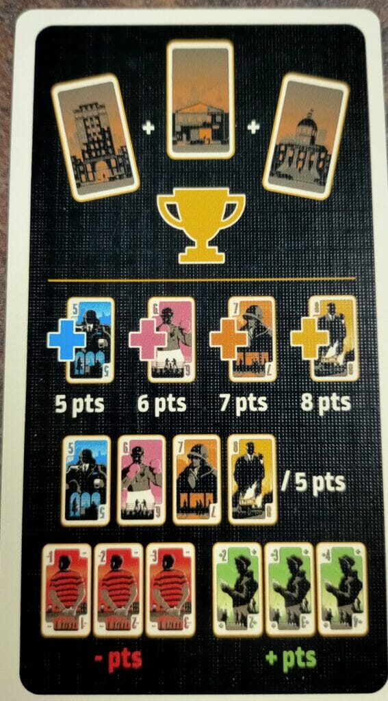 Cinq cartes en main pour chacune des manches et des joueurs. À chaque tour, on pose une carte sur une ligne commune, et lors de chaque manche on va pouvoir décider de prendre les cinq dernières cartes posées afin de constituer sa collection. Collection qui sera comptabilisée à l’issue des quatre manches, sous forme de majorité de chacune des quatre familles, et des séries de famille. Ça à l’air benêt présenté comme ça, seulement on va pouvoir rajouter des cartes qui enlèveront des points afin de piéger l’adversaire, lui donner envie de pousser un peu plus loin le nombre de cartes avant de prendre. En fait, chaque pose est un choix très engageant. Et il y a une fin immédiate si l’un des joueurs a collecté les trois bâtiments du jeu. On connaît le nombre de cartes de chaque famille, on peut donc calculer ce qui va rester en dernière manche dans les mains, et se prêter au jeu des pronostics, tout en étant quand même soumis à un aléa de départ, trois cartes étant écartées secrètement de la partie.