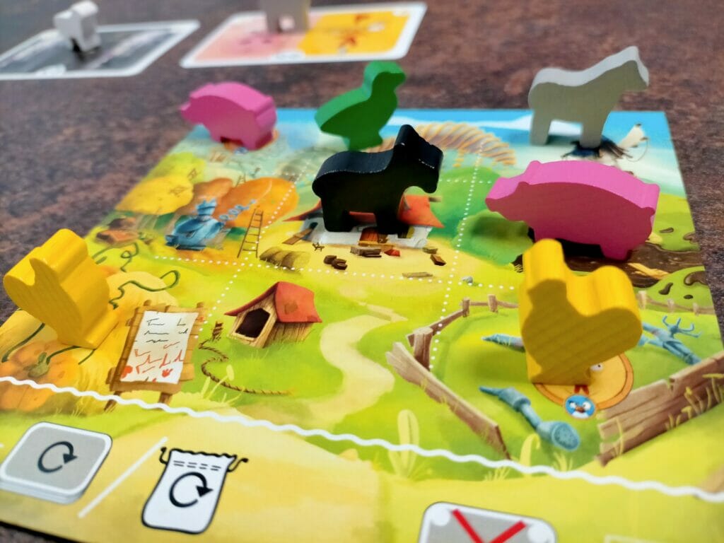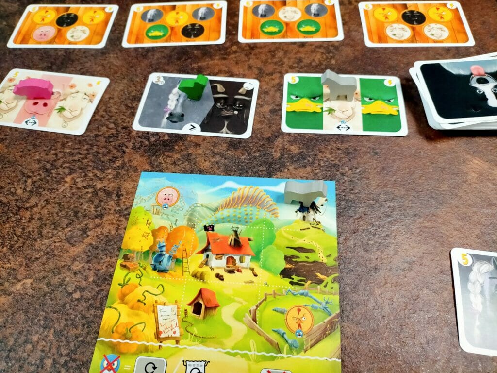 Il s’agit dans ce jeu de créer une belle ferme et de faire cohabiter les différentes espèces animales. Non, pas de ressources, pas d’agricolisme, Farm Club, c’est plutôt la hiérarchie en mode animale qui va nous guider. Vous connaissez La Ferme des animaux ? Le voilà adapté dans une grille de 4 x 4 animaux. Ainsi à chaque tour, vous prenez un couple animal / carte de scoring. Vous placez l’animal dans une case de la ferme, et conservez la carte de scoring pour la fin de partie si elle présente un sablier ou bien validez la carte si la contrainte est réalisée. Cette contrainte peut être un placement d’animaux, une domination d’une espèce sur une autre, ou ne posséder exactement qu’un animal de cette espèce. Possible de remplacer tous les animaux ou toutes les cartes du marché en dépensant un jeton durement gagné. Laissez les animaux quelques temps sans chef, et vous savez ce qu’il se passe ? Le monde n’est pas prêt pour une vie en autogestion, il va falloir désigner un animal chef, qui bien sûr va aller habiter dans la maison des humains au centre de la ferme. Une fois dans la partie, vous pourrez, à la place de votre tour, prendre également un animal et une carte présentant les animaux à admettre dans sa ferme pour marquer les 6 points. L’animal va habiter la ferme, et les vaches seront bien gardées.