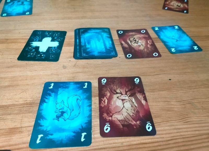 Une manche c’est simple : deux cartes en main, on joue à son tour l’une de ses cartes ou de la main d’une autre personne, ou encore des cartes visibles du centre, ou cachées de la pioche. Pour remporter cette manche, il me faut avoir la somme de cartes la plus haute. Ou la plus basse si une carte « changement » a été jouée. Il y a 10 cartes bleues et 10 cartes rouges, dont quelques cartes qui vont offrir des possibilités : on l’a vu, celles qui changent le but de la manche, le 3 bleu ou le 7 rouge, il y aussi les griffes qui font défausser une carte chez un adversaire, 4 cartes qui comportent un cœur, et si on rassemble les amoureux devant soit, on gagne immédiatement, et on perd aussi sec si on pose la carte piège.