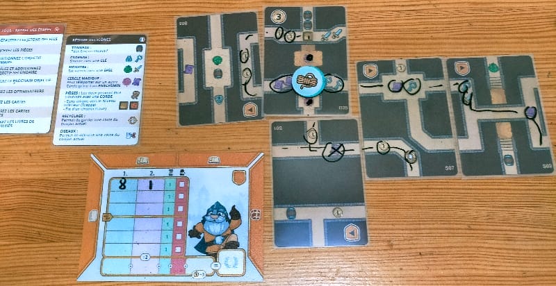 Et avant de rentrer dans le donjon, il va falloir construire au mieux votre labyrinthe avec vos 5 cartes. Car, si on connaît l’objectif commun à collecter pour la manche (le tonneau, par exemple), on ne prendra connaissance de l’objectif secondaire qu’une fois tous les aventuriers sortis de leur labyrinthe, alors autant passer par un max d’épées, clés, parchemins et pièces, surtout les pièces qui vont vous servir à acheter de nouvelles cartes, et oui, il s’agit d’un deckbuilding. Vos cartes achetées sont de suite de la partie, ainsi vous pouvez cibler les cartes contenant l’objectif de la prochaine manche. Vous pouvez aussi acheter des cartes vous apportant d’autres pouvoirs, ou des objets comme des clés pour ouvrir des cadenas, cordes pour passer les trappes..