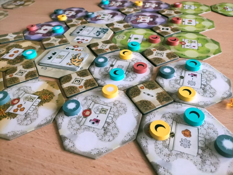 Les druides sont à l’honneur en ce début de période sombre, période de Samain. Après ceux de Feld dans Edora, voici ceux de Johannes Goupy de Salamandra. Dans ce jeu mis en lumière par Camille Chaussy, on va faire du placement d’ouvrier définitif. À chaque manche, on introduit 2 ou 3 nouveaux ouvriers, et on va activer et réactiver ceux déjà en place, en vue de récolter des ressources et faire des actions. Ça démarre doucement avec nos 3 druides de la première manche, on prend les emplacements favorables et disponibles, on dépense ses ressources pour construire de nouvelles tuiles qui viendront agrandir la zone de jeu commune et apporteront des bonus. Ces bonus, ce sont par exemple des cartes qui en cours de jeu seront intéressantes et en fin de partie concourront pour des points de majorité.