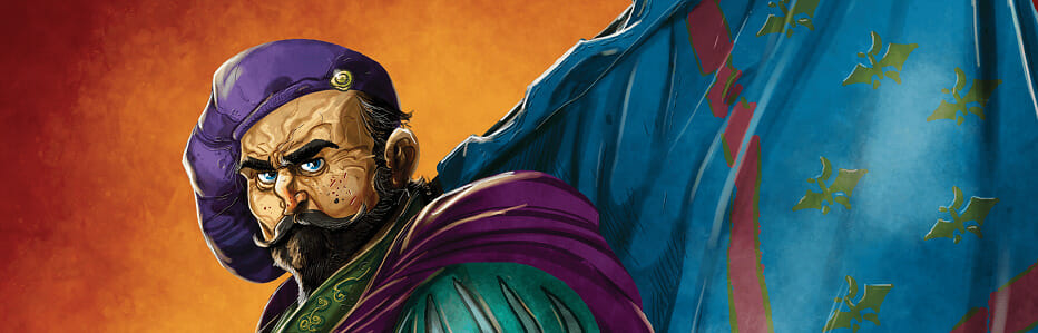Développement toujours, points de victoire toujours. Foi et vice sont toujours là, tout comme les dettes et actes de propriété. Désormais, plus vraiment d’ouvriers : c’est donc au Vicomte de se balader pour aller déclencher les actions, autour d’une rondelle un peu particulière : son extérieur permet de se développer (avec du gain de ressources et de la construction de bâtiments), quand le centre permet d’envoyer des petits ouvriers (ah, les voilà, les fainéants !) à la construction du château, ou alors on va au scriptorium pour copier du manuscrit.