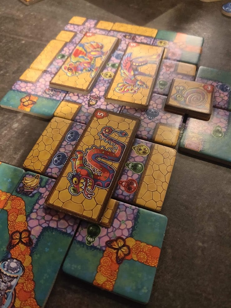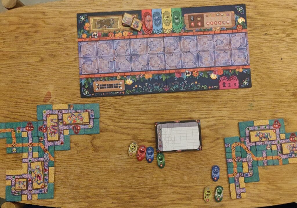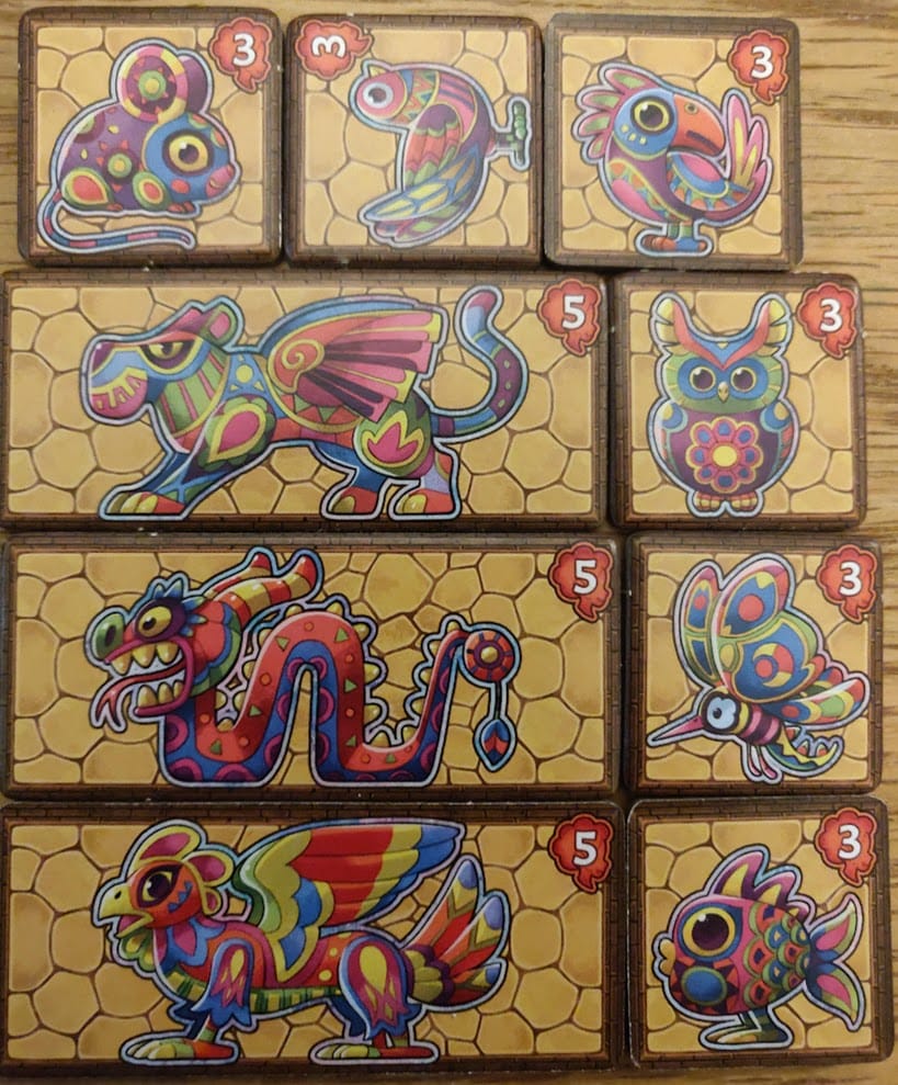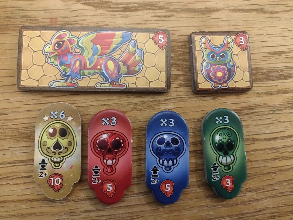 On a alors une multitude de décomptes : les visiteurs et papillons vous rapporteront des points directs (avec un avantage sur les papillons qui disposent de leur propre chemin), les ballons seront une petite course au premier qui en obtient 3 d’une même couleur, les zones, carrées ou rectangulaires, de chemins fermés permettront de poser des « chimères » (alebrijes), et divers autels permettront de bonifier encore plus les différents éléments du parc. Bref, on va faire du point avec tout ce que l’on posera et il faudra en faire plus que les autres.